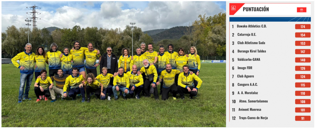Emoción durante toda la mañana del domingo 27 de octubre en Durango, en la que por fortuna la lluvia no hizo acto de presencia como se temía. Nuestro equipo fue liderando la competición hasta la contabilización de 7 pruebas. Posteriormente fuimos bajando hasta la 5ª posición definitiva tras un largo rato de incertidumbre. Los resultados eran muy ajustados. Al final dos de nuestros atletas, filiales, consiguieron unos esplendidos resultados en forma de récords. Uno merced al pertiguista Francisco J. Hernández con un 81,33% y otro Alfonso Rey en 800 m con 92,29% siendo este el mejor porcentaje logrado en el campeonato. La actuación de todos los atletas del club Valdizarbe-GANA ha sido impresionante. Enhorabuena!!!